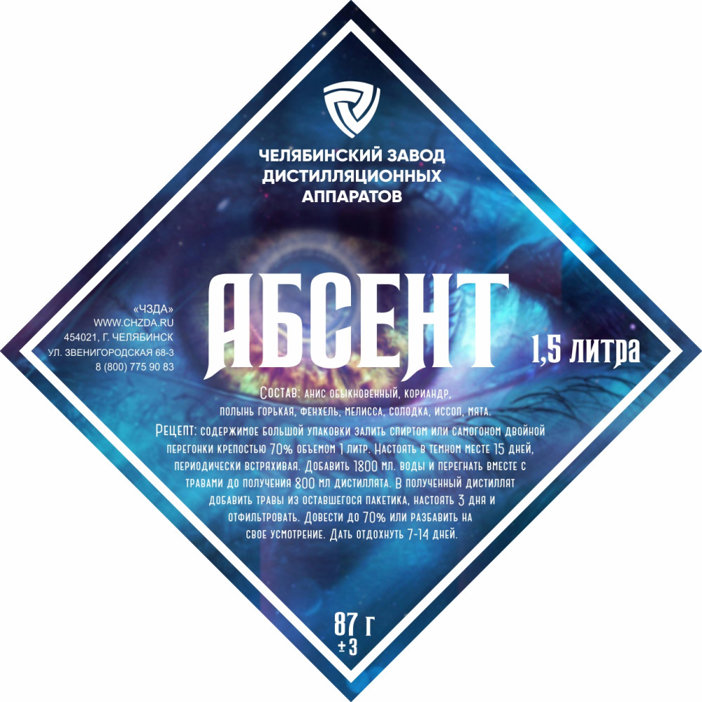 The set of herbs and spices "Absinthe" includes: anise ordinary, coriander, wormwood, fennel, lemon balm, licorice, hyssop, mint.