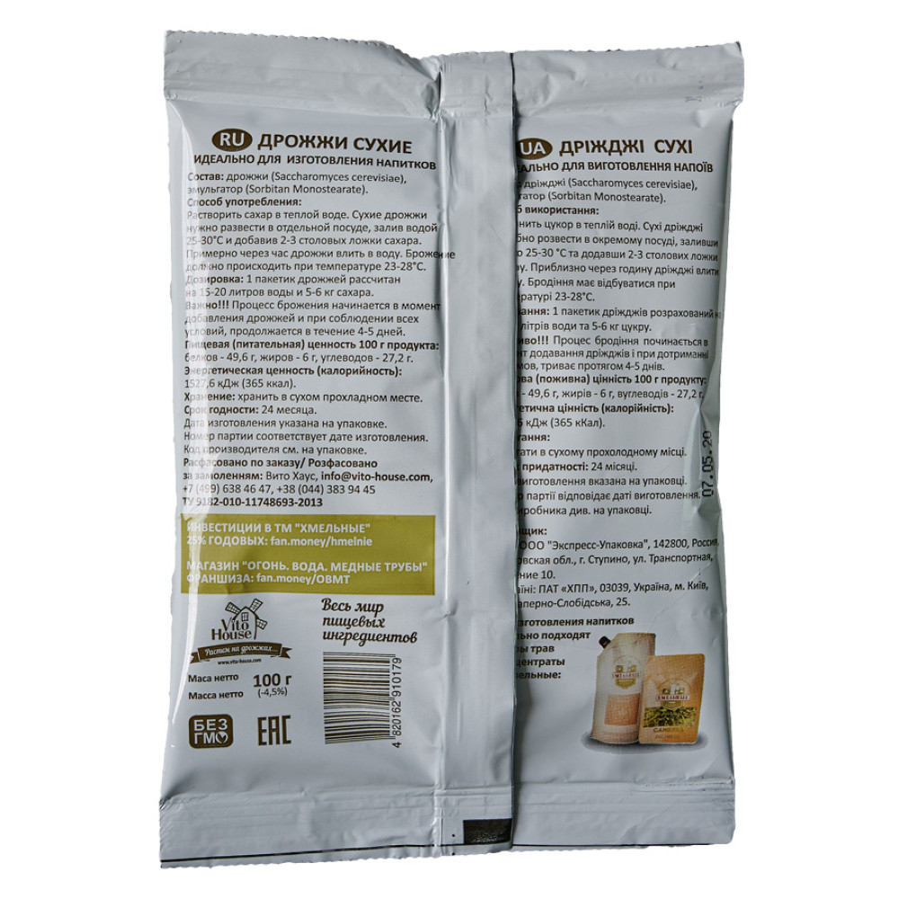 Dry yeast "Ukrainian Hops" sold in a sealed package to packaging 100g sealed packaging provides convenient storage and stability of the product - the shelf life of the closed package for 2 years.