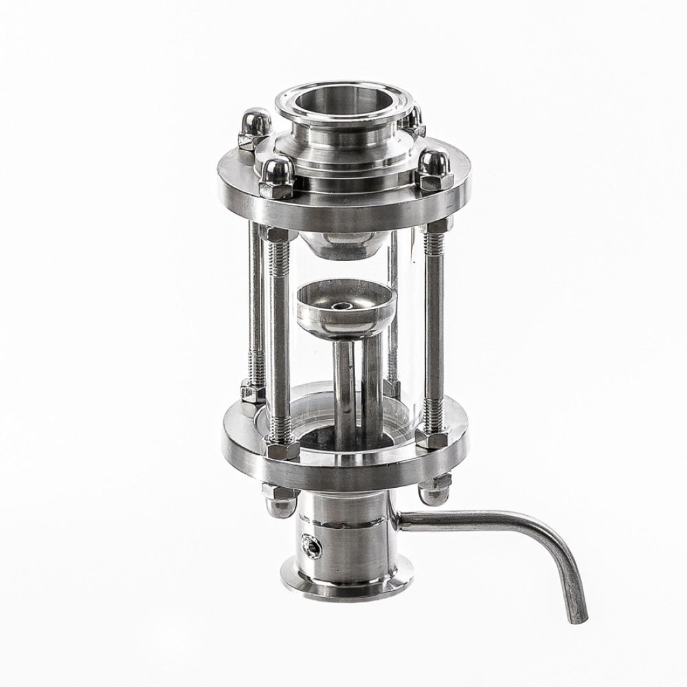 Designed for column-type moonshine stills with clamp connections. Equipped with a seat for an electronic thermometer. Using the take-off unit in the column, it is possible to select "heads" by adjusting the take-off with a needle valve. The sampling unit has a fitting for a thermometer and a tube for the outlet of reflux, on which a needle valve is installed to regulate the flow.