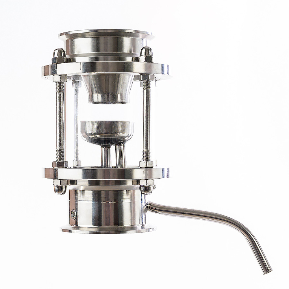 Designed for column-type moonshine stills with clamp connections. Equipped with a seat for an electronic thermometer. Using the take-off unit in the column, it is possible to select "heads" by adjusting the take-off with a needle valve. The sampling unit has a fitting for a thermometer and a tube for the outlet of reflux, on which a needle valve is installed to regulate the flow. The outer diameter of the drain tube is 10 mm.