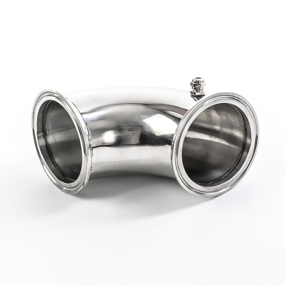 The connecting element provides a reliable, strong and tight connection of pipes in the distillation column and the still. Transition 90 degrees with a fitting for an electronic thermometer with a probe with a diameter of up to 3,5 mm is made of food grade stainless steel AISI 304. Mounting - for a 3-inch clamp (for a 91 mm flange)