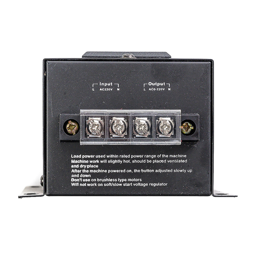 Use a single-core copper wire when connecting; when using a stranded one, be sure to tin the tip with a soldering iron. 220 volt power supply and load are connected at the terminals and tightened with screws. The socket on the device body is designed to output an unregulated constant voltage of 220 volts, 10 A. The buttons on the device panel are designed to regulate the voltage in percentage from 0-100 (indication on the front panel) or in volts from 0 to 225 in steps (indication on the top cover device). When the instrument is turned on again, the previous settings are reflected.