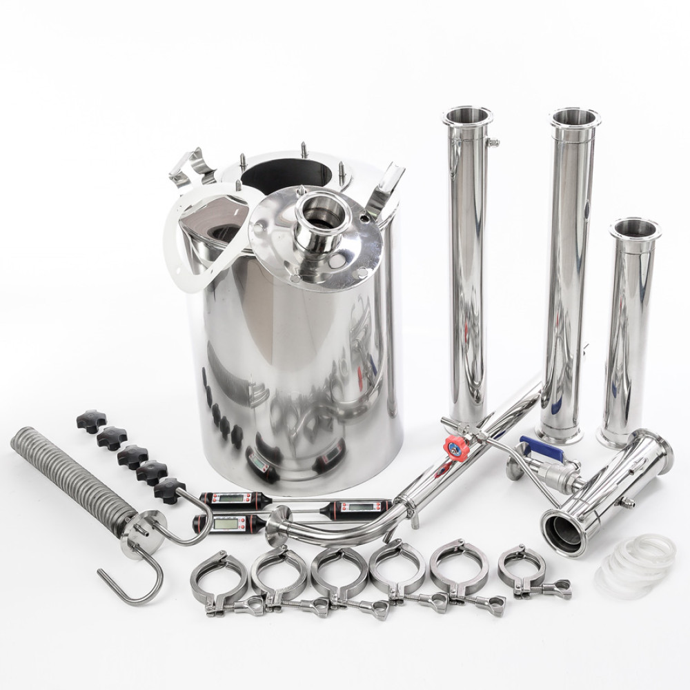 CheckoutThe set of equipment differs significantly from outdated moonshine stills with dry steamers, here the strengthening of the alcohol mixture is much more efficient due to the supply of water to the Dimrot refrigerator, and not just the pressure drop in the dry steamer. Also, the rectifier perfectly separates alcohol from fusel oils, so there is no need for many hours of filtration with coal, milk and egg proteins.