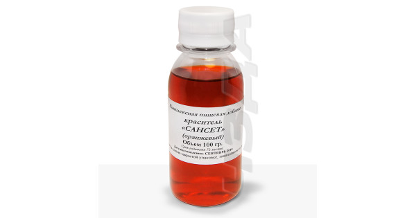 Food dye "Sunset" Orange 100 ml (E110) is used in industry for dyeing various food groups. It is used as its own for dyeing various drinks and products from orange to yellow shades.      ..